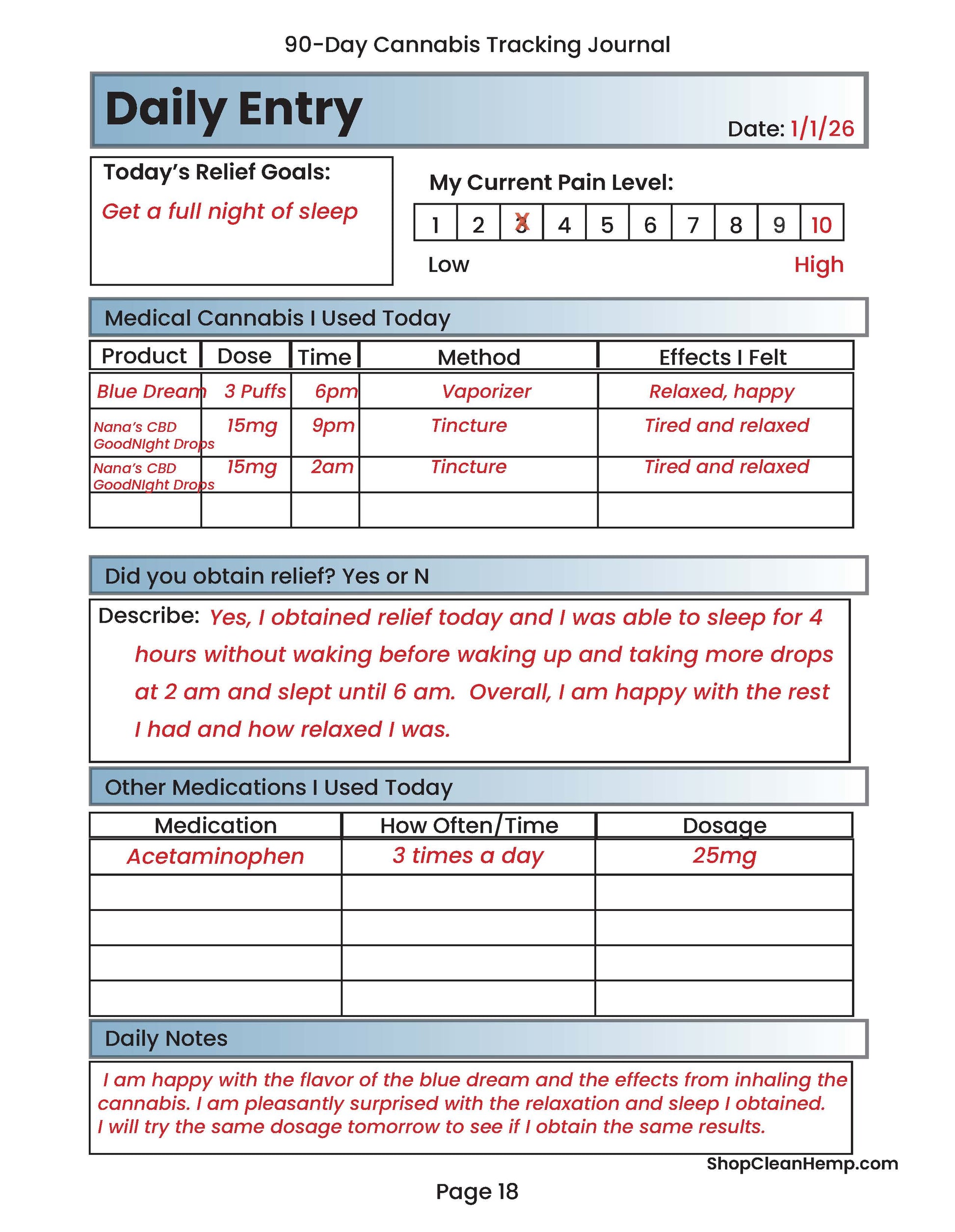 Track your cannabis/CBD use for 90-Days to optimize relief and gain the confidence to move forward with using cannabis as an alternative. For single and personal use only.